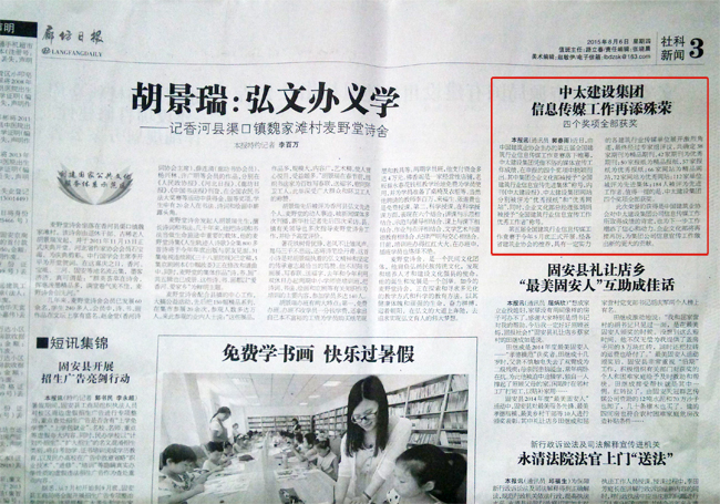 此次榮譽(yù)獲得是中國建筑業(yè)協(xié)會(huì)對(duì)中太建設(shè)集團(tuán)公司信息傳媒工作所取得成績(jī)肯定,也為下一步工作增添了信心和動(dòng)力。企業(yè)文化部將再接再厲,為集團(tuán)公司信息宣傳工作做出新更大貢獻(xiàn)。