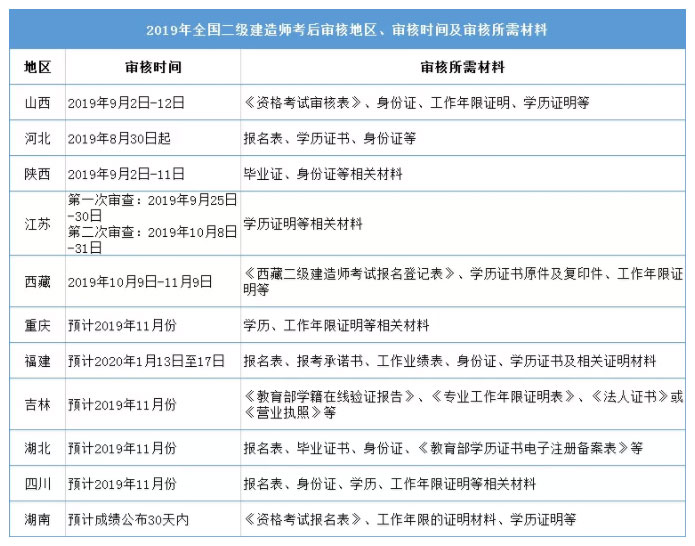 二建考試到現在已過了五月,大部分省市都已公布成績及合格標準。2019年有不少省市二建是有要求考后審核的。除了江西,其他地方怎么規定呢?以下是整理的二級建造師考后審核的地區及資料,供大家參考,希望對考生們有所幫助!(詳細信息以官方文件為主)