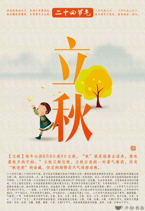 今天是立秋,意味著夏季的結(jié)束,秋季的開始,氣溫逐漸下降,雨水逐漸減少。我國幅員遼闊,就節(jié)氣而言不可能同時進(jìn)入涼爽的秋季的,是有一些差別的。生活在廊坊這個地方,四季分明的氣候,是老天恩賜的福分。不冷不熱的天,氣候宜人,真正是秋高氣爽。我國古代將秋季劃分為三候:一候涼風(fēng)至,二候白露生,三候寒蟬鳴。是說立秋后刮風(fēng)人們會感到?jīng)鏊蟮卦绯繒徐F氣產(chǎn)生,并且秋天感陰而鳴的寒蟬也開始鳴叫。民間流行“貼秋膘”,就是在立秋這天吃些美味佳肴,老百姓家就是燉肉、包餃子。